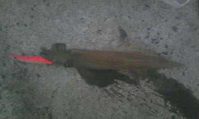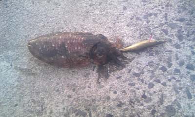 やっと浮上させ姿が見えたところで、いつもは水を吐き多少軽くなるんですが、水を吐く音も聞こえず重たいまま・・・。ゴミか?と思って寄せてくると・・・アオリイカ?・・・でもアオリイカ独特の引きも無かったし・・・。